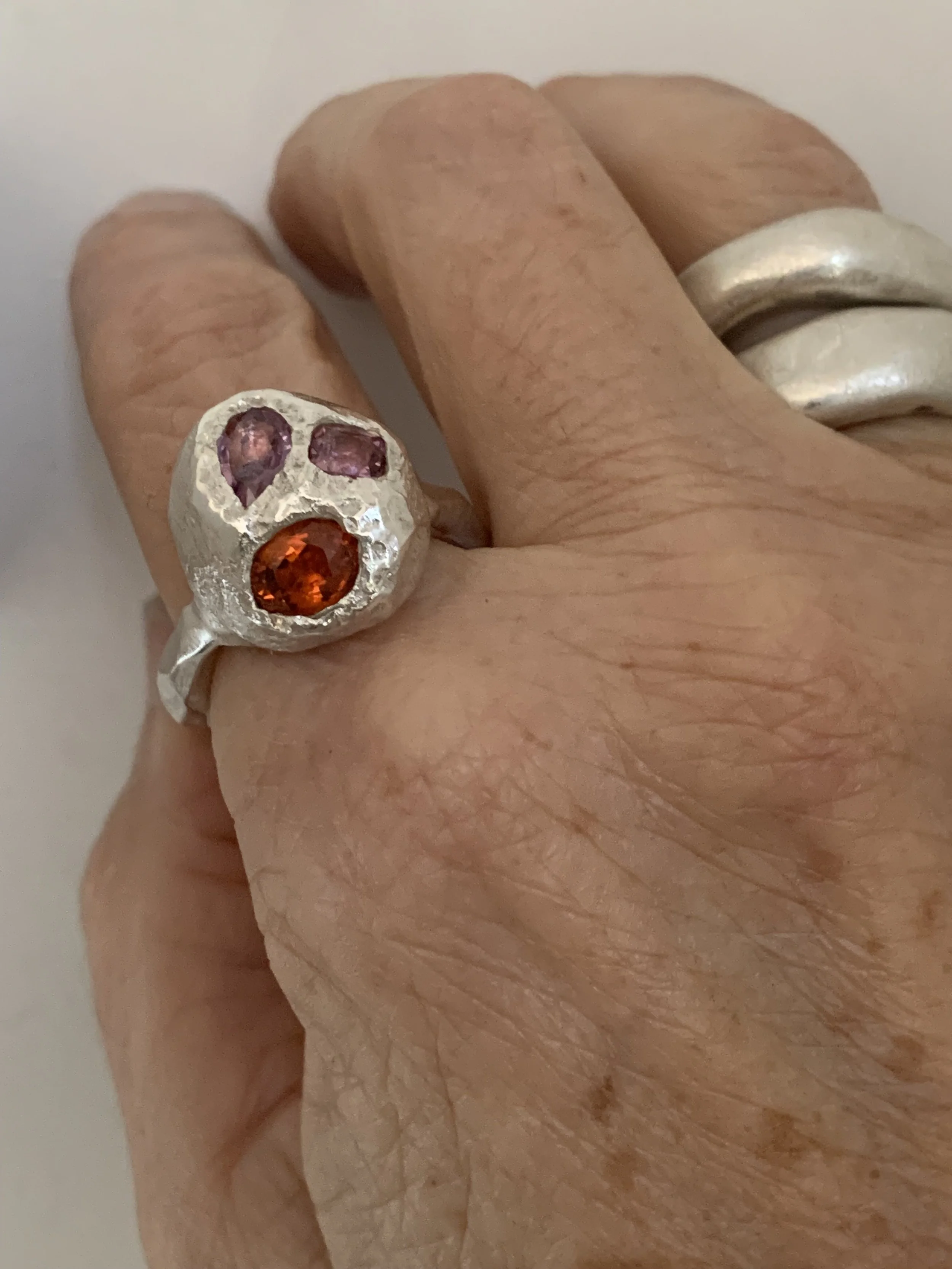 Material - sterling silver, spessartine garnet, spinel, sapphire